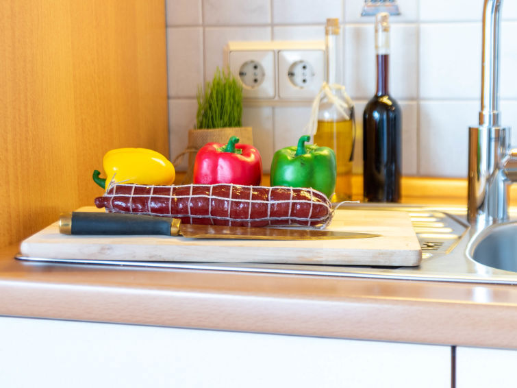 "Ferienwohnung Schäfer", appartement 3-kamers op de 1e verdieping. Gedeeltelijk afgeschuinde daken, gezellig ingericht: woonkamer met Kabel-TV (Flatscreen TV). 1 kamer met 1 2-pers bed. 1 kamer met 2 bedden. Keuken (4-pits kookplaat, oven, broodrooster, waterkoker, elektrische koffiemachine) met eettafel. Uitgang naar het balkon. Douche/WC. Balkon 25 m2. Balkonmeubilair. Niet geschikt voor kinderen onder 6 jaar. Niet rokers woning. Rookmelders.