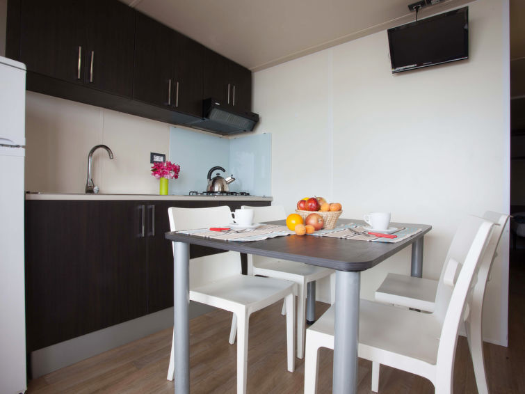 "Baia Relax New Plus", 3-kamers mobilhome 25 m2. Modern ingericht: woon-/eetkamer met eettafel en TV. 1 kamer met 1 2-pers bed (140 cm). 1 kamer met 2 bedden (70 cm), 1 x 1 stapelbedden (65 cm, lengte 170 cm). Kookhoek (4 kookpitten (vlammen), diepvriezer). Douche/WC. Air-conditioning, heteluchtverwarming. Terras overdekt. Terrasmeubelen. Ter beschikking: kinderbed tot 2 jaar (extra). Internet (Internet (WiFi), extra). Parkeerplaats (1 Auto). Niet rokers woning. Bedindeling is flexibel. Er zijn meer slaapmogelijkheden beschikbaar dan het maximaal toegestane aantal personen dat echter niet mag worden overschreden. IT023022B1P4KHX4L9