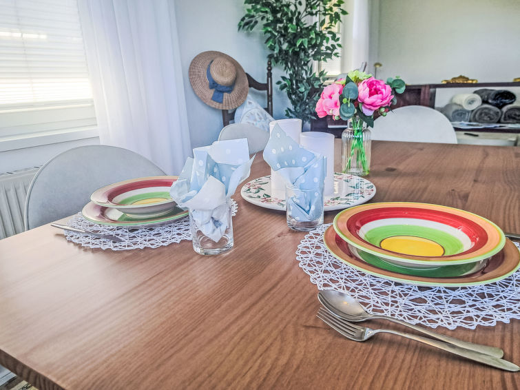 "Rose", villa 5-kamers 130 m2. Smaakvol en romantisch ingericht: hal. Woonkamer. 1 2-pers. kamer. Bad/WC, Sauna. Bovenverdieping: woon-/eetkamer met 1 2-pers divanbed, eethoek en Kabel-TV. Uitgang naar het balkon. 1 2-pers. kamer. Kleine keuken (oven, afwasmachine, 4 keramische glas kookplaten, broodrooster, waterkoker, elektrische koffiemachine). Bad/WC met hoekbad. 2e Verdieping: 1 2-pers. kamer. Klein terras, kleine tuin. Terrasmeubelen. Zeer mooi uitzicht op het meer. Ter beschikking: wasmachine, droger, sauna.