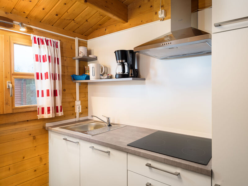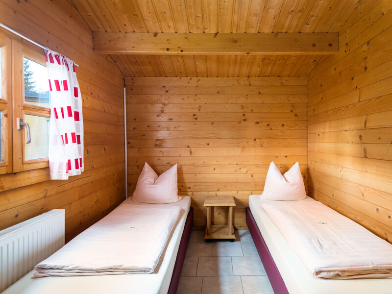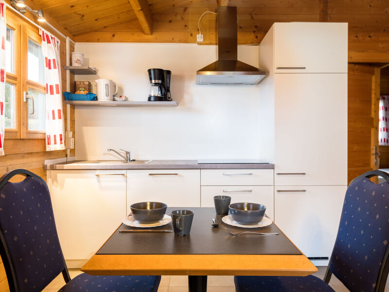 "Holzchalet E", bungalow 3-kamers 52 m2. Gezellig ingericht: woon-/eetkamer 28 m2 met Sat-TV (Flatscreen TV). Uitgang naar het terras. 1 kamer 6 m2 met 1 2-pers bed (160 cm, lengte 190 cm). 1 kamer 6 m2 met 1 x 2 stapelbedden (80 cm, lengte 190 cm). Kookhoek (4 keramische glas kookplaten, magnetron, elektrische koffiemachine) met kleine bar. Douche/WC. Gas-verwarming. Terras 15 m2 gedeeltelijk overdekt. Terrasmeubelen. Mooi panoramazicht op de bergen en het landschap. Rookvrij huis. Maximaal 2 huisdieren/honden toegestaan. Rookmelders, brandblusser. Bungalow in houten bouw.