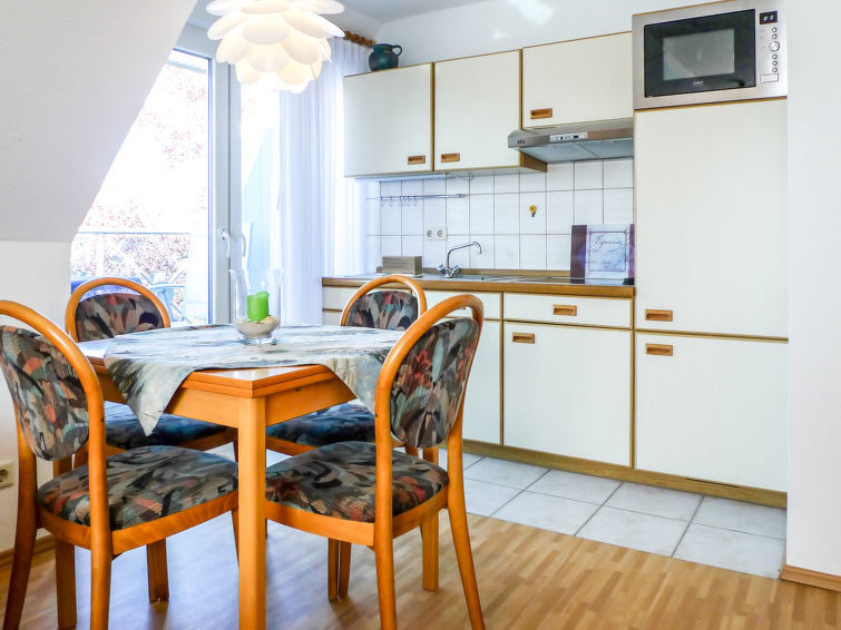 Appartement 2-kamers 40 m2, op de bovenverdieping. Gezellig ingericht: woon-/eetkamer 16 m2 met 1 divanbed (140 cm, lengte 200 cm), Sat-TV (Flatscreen TV), radio. 1 kamer 12 m2 met 1 2-pers bed (2 x 90 cm, lengte 200 cm). Kookhoek (4 keramische glas kookplaten, broodrooster, waterkoker, magnetron, elektrische koffiemachine, combimagnetron). Douche/WC. Balkon. Balkonmeubilair. Ter beschikking: kinderstoel (extra). Niet rokers woning.