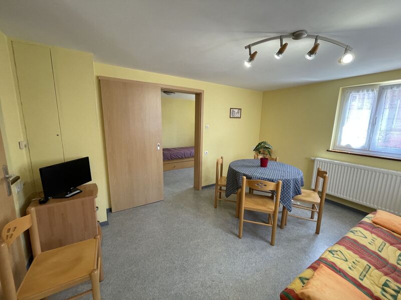 "apt 1", appartement 2-kamers 44 m2, op de begane grond. Mooi ingericht: woon-/eetkamer met 1 2-pers divanbed (130 cm, lengte 190 cm), TV (Flatscreen TV). 1 kamer met schuifdeur met 2 bedden (80 cm, lengte 190 cm). Keuken (mini-oven, 2 inductiekookplaten, broodrooster, waterkoker, elektrische koffiemachine). Douche/WC. Olie-verwarming. Ter beschikking: wasmachine, strijkijzer. Internet (Internet (WiFi), gratis). Parkeerplaats. Niet rokers woning. Privé ingang. Boekingen zijn alleen voor vakantiedoeleinden toegestaan.