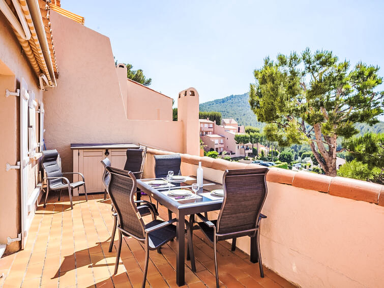 Appartement 2-kamers 31 m2, op verhoogde begane grond. Comfortabel en modern ingericht: woon-/eetkamer met 1 2-pers divanbed (140 cm, lengte 190 cm). Uitgang naar het terras. 1 kamer met 1 2-pers bed (160 cm, lengte 200 cm), TV (Flatscreen TV). Kookhoek (2 inductiekookplaten, elektrische koffiemachine, pads voor de koffiemachine (senséo) extra, combimagnetron). Douche/WC. Air-conditioning, heteluchtverwarming. Terras 19 m2, op het westen gelegen. Terrasmeubelen. Zeer mooi uitzicht op zee. Ter beschikking: wasmachine, strijkijzer. Internet (Internet (WiFi), extra). Parkeerplaats nr. 66. Parkeerplaats alleen voor een kleine auto. TV alleen FR. Rookmelders. 83112 000243 FM