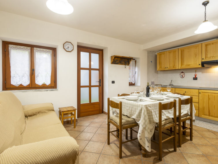 Appartement 2-kamers 50 m2 op 2 verdiepingen. Doelmatig en comfortabel ingericht: woon-/eetkamer met eettafel, TV en verwarming. Kookhoek (4 inductiekookplaten, broodrooster, waterkoker, magnetron). Douche/bidet/WC. Houtverwarming. Bovenverdieping: (steile trap), 1 kamer met 1 x 2 stapelbedden, 1 2-pers bed en 1 2-pers bed. Uitgang naar het terras. Parketvloeren. Klein terras. Terrasmeubelen. Mooi panoramazicht op de bergen. Ter beschikking: haardroger. Internet (WiFi, gratis). Koelkast zonder vriesvak, niet rokers woning. Maximaal 1 huisdier/hond toegestaan. Privé ingang, rookmelders, brandblusser. ITO14074C2WTDK8KIC