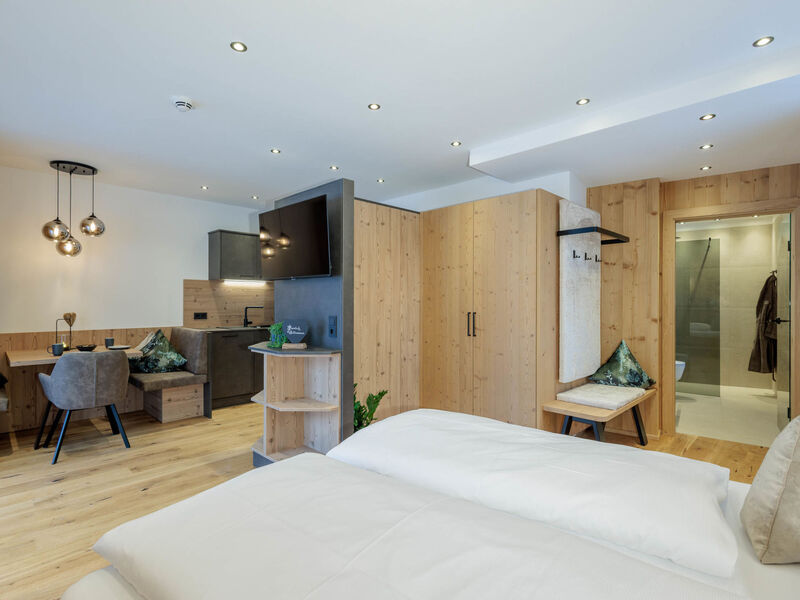 "Mountain Studio Nr 204", studio 1-kamer 33 m2 op de 1e verdieping. Smaakvol en met veel hout ingericht: woon-/slaapkamer met 1 2-pers divanbed, 1 2-pers bed, eethoek, kookhoek, Sat-TV en internationale TV-zenders (Flatscreen TV). Uitgang naar het balkon. Open keuken (oven, afwasmachine, 4 keramische glas kookplaten, broodrooster, waterkoker, magnetron, elektrische koffiemachine, pads voor de koffiemachine (Nespresso) extra). Douche/WC. Vloerverwarming. Houten vloeren. Balkon. Balkonmeubilair. Zeer mooi panoramazicht op de bergen en de plaats. Ter beschikking: kluis, haardroger. Internet (Internet (WiFi), gratis). Garage (1 Auto). Oplaadstation. Niet rokers woning. Geschikt voor allergiepatiënten. 50411-008165-2024