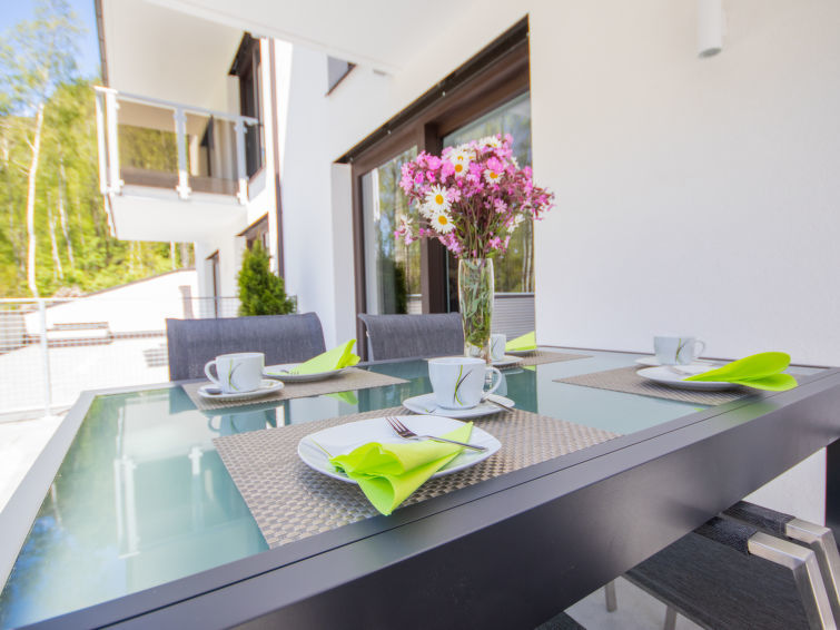 "Runhof Living", appartement 2-kamers 70 m2, op verhoogde begane grond. Ruim en licht, zeer comfortabel en stijlvol ingericht: hal. 1 2-pers. kamer met TV. Uitgang naar het terras. Woon-/eetkamer met 1 2-pers divanbed en TV. Uitgang naar het terras. Keuken (oven, afwasmachine, 4 inductiekookplaten, broodrooster, waterkoker, diepvriezer, elektrische koffiemachine) met eettafel. Bad/douche, aparte WC. Verwarming. Parketvloeren. Groot terras, op het noorden gelegen en op het westen gelegen. Terrasmeubelen, ligstoelen (2). Mooi panoramazicht op de bergen. Ter beschikking: wasmachine, kinderstoel, kinderbed, haardroger. Internet (WiFi). Garage. Niet rokers woning. Maximaal 1 huisdier/hond toegestaan. Rookmelders.